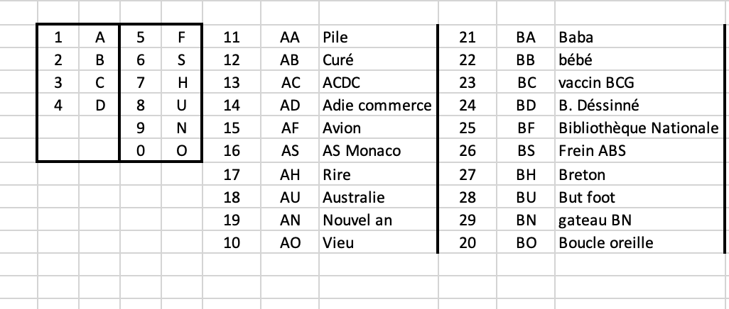 Ainsi, pour moi, 11 devient AA, 34 est CD, 95 est NF et ainsi pour toutes les paires, soit une centaine.